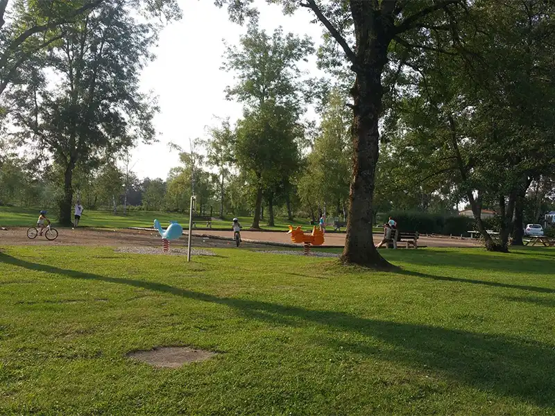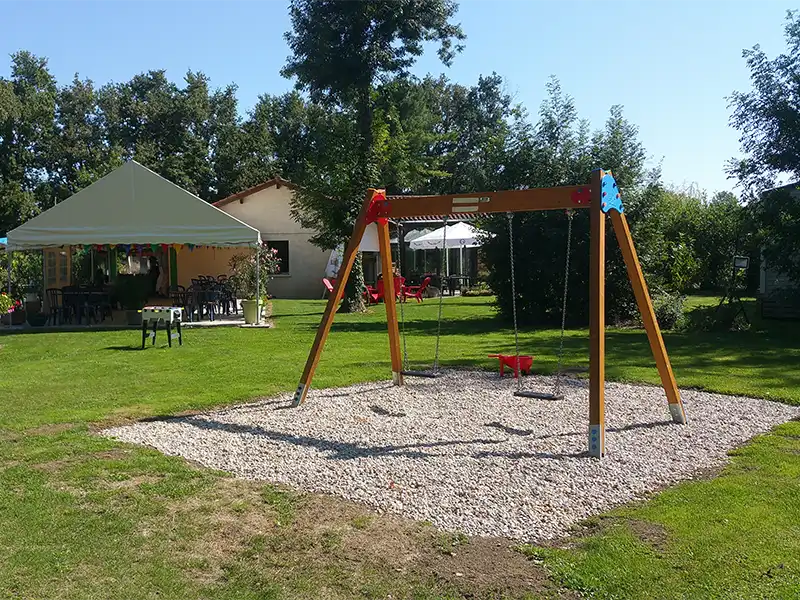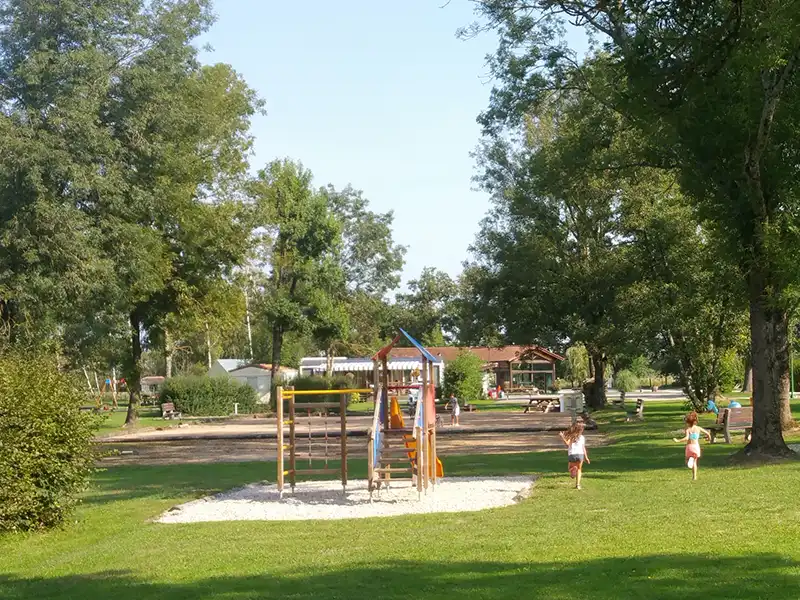 Au camping Paradis des Dombes, découvrez notre aire de jeu au cœur du parc arboré, offrant une palette d'activités pour tous.