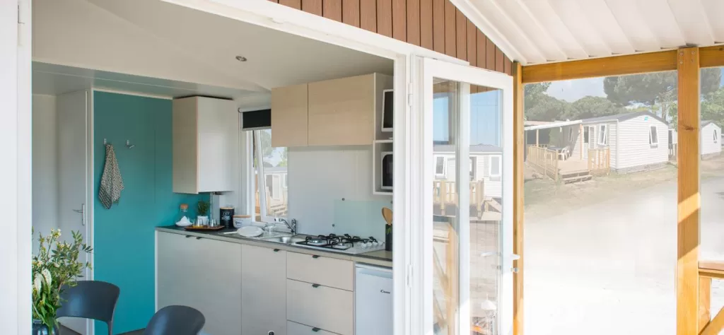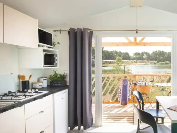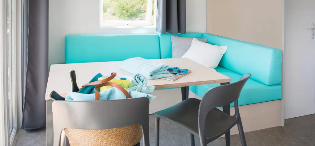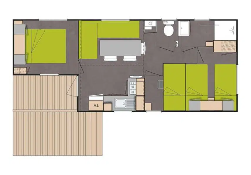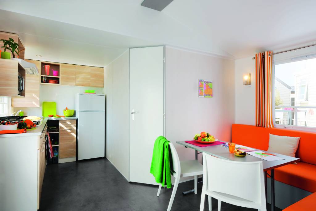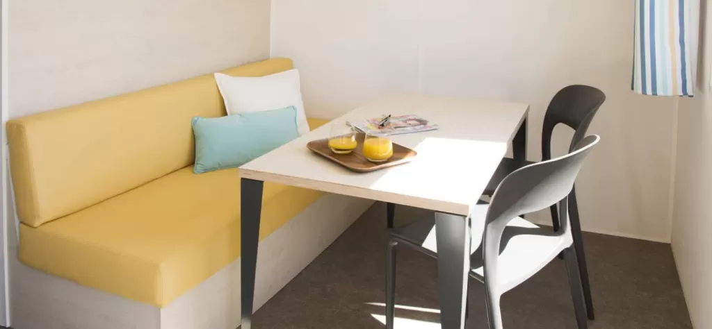 Mobil home 1 chambre + 1 banquette lit avec terrasse couvertepour maximum 3 personnes.