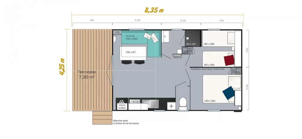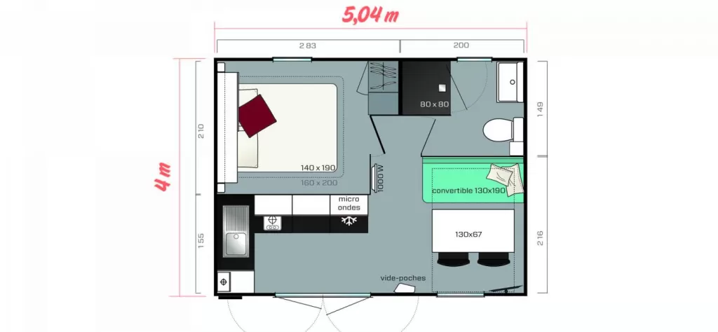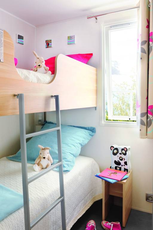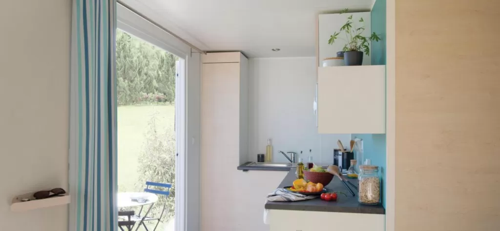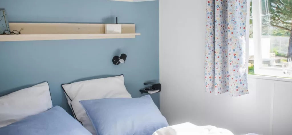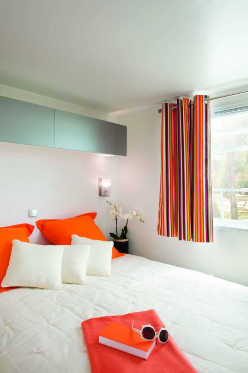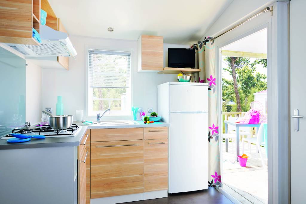 Mobil home 1 chambre + 1 banquette lit avec terrasse couvertepour maximum 3 personnes.