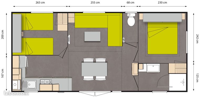 Mobil home 3 chambres, spacieux et lumineux avec terrasse couverte.